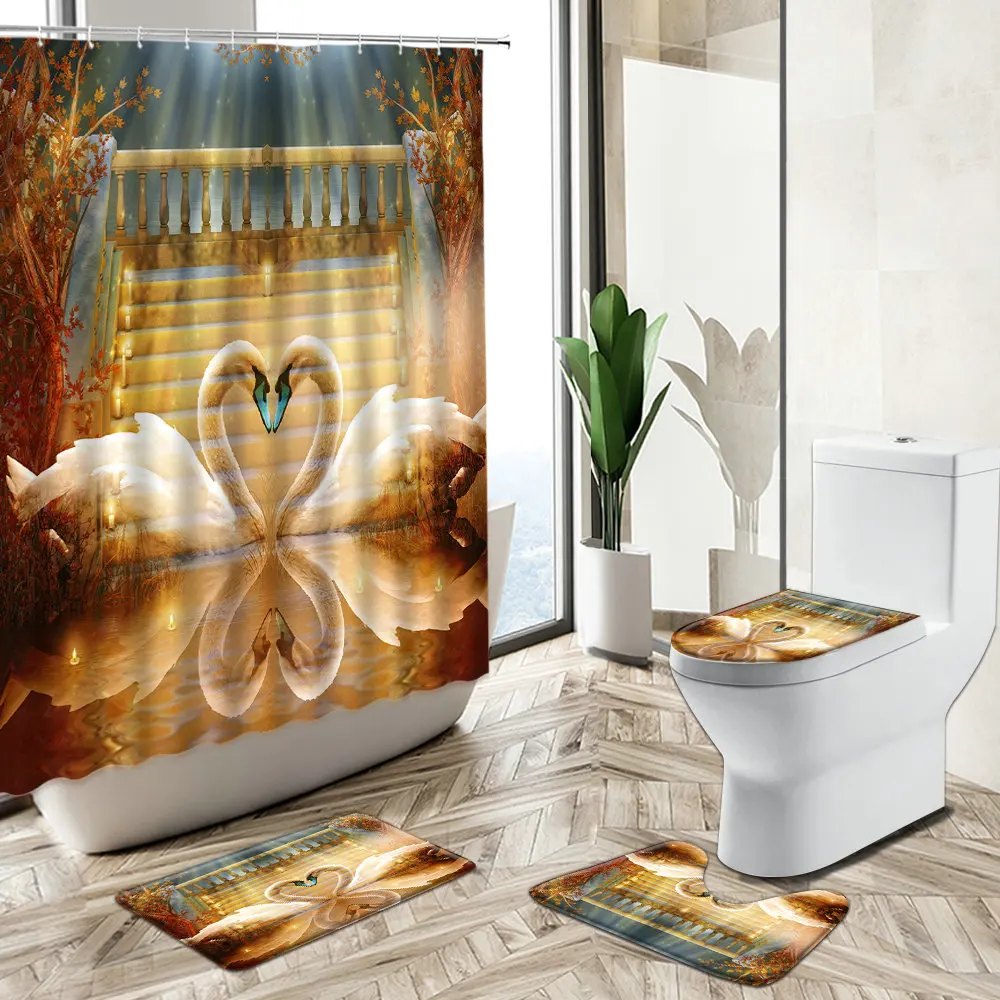 Product Name: Swan Flower Lake Scenario Tenda Per Doccia Coppia Romantica Decorazioni Per Il Bagno Regalo Di Festa Tappeto Antiscivolo Coperchio Per Wc Set Tappetino Da Bagno