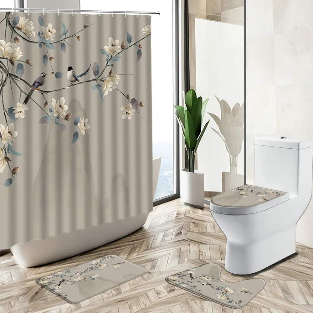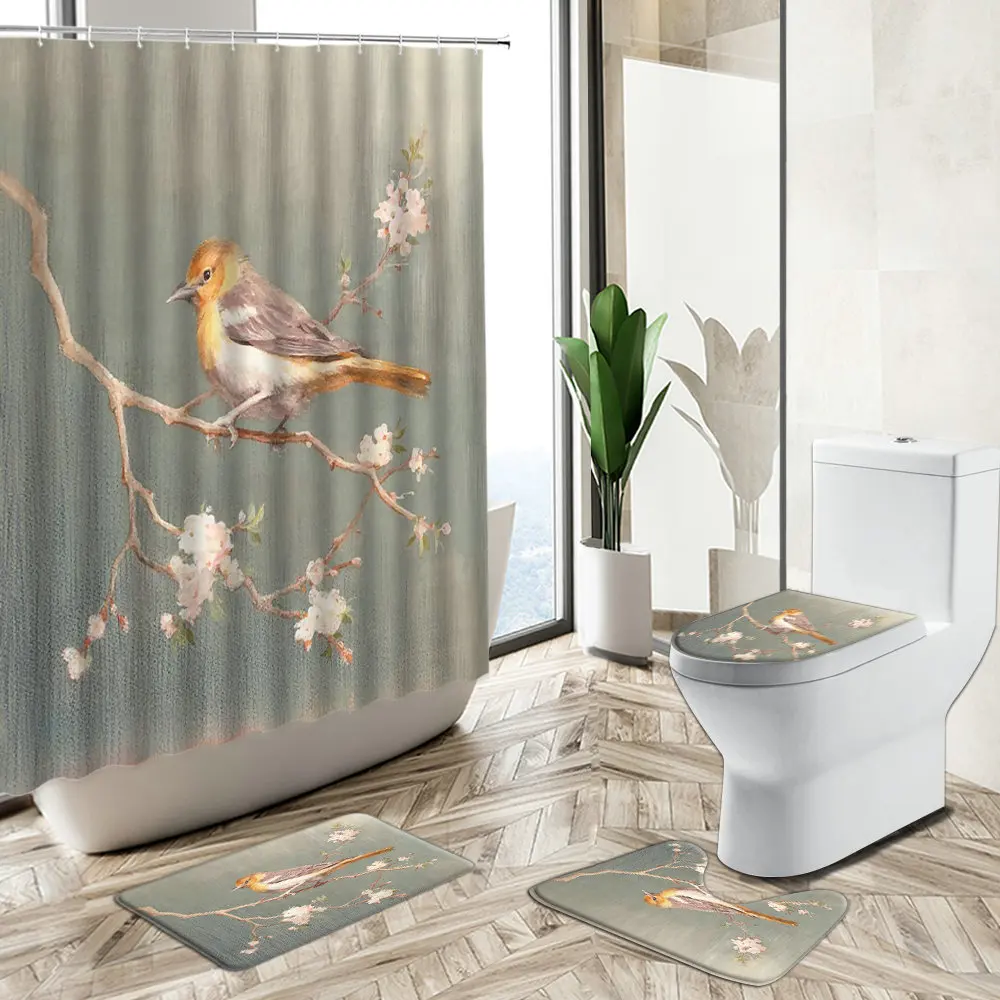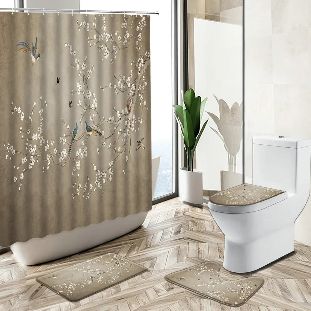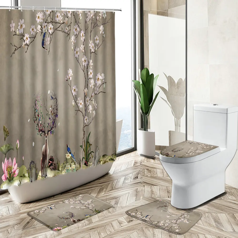 Product Name: Tenda Da Doccia Per Uccelli In Stile Cinese Fiore Piccolo Alce Floreale Pappagallo Animale Bagno Decor Tappeto Antiscivolo Copriwater Set Tappetino Da Bagno