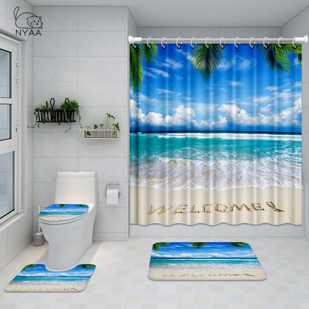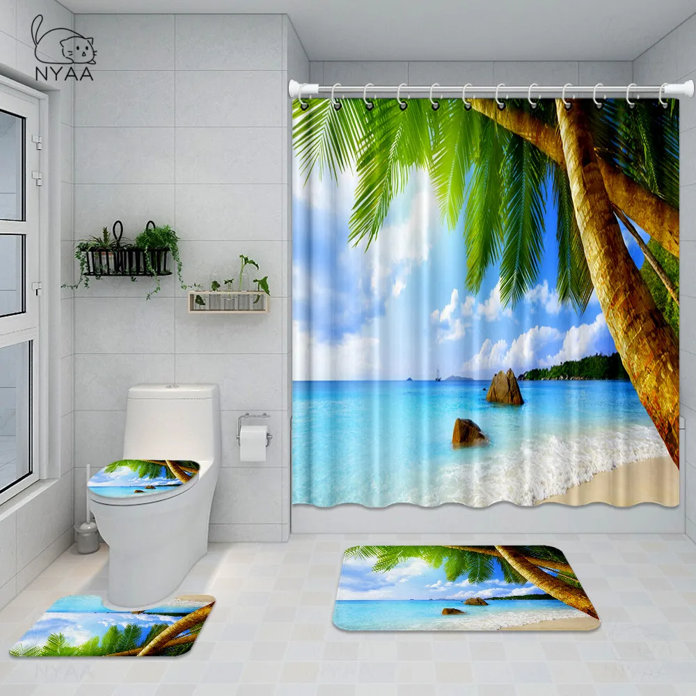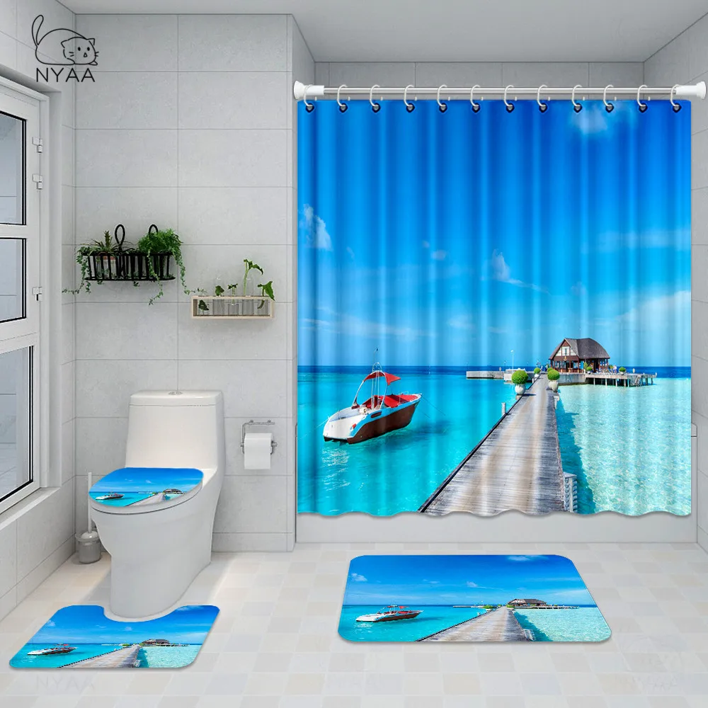 Special Offer Spiaggia Costiera Scenario Stampato Modello Tenda Da Doccia Piedistallo Tappeto Coperchio Copriwater Tappetino Da Bagno Set Tende Da Bagno Con Ganci Discount (45%OFF) Today!