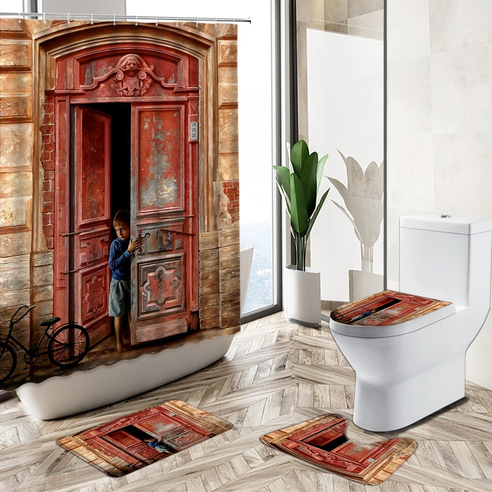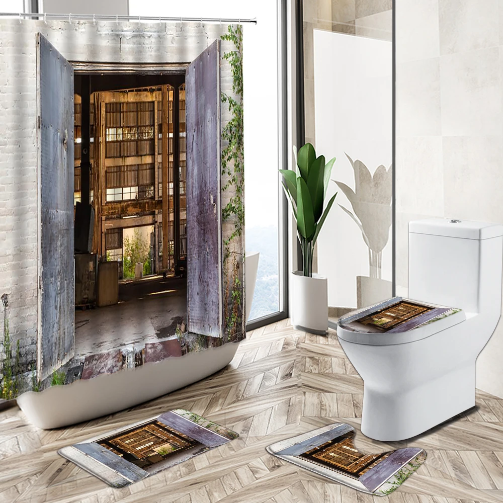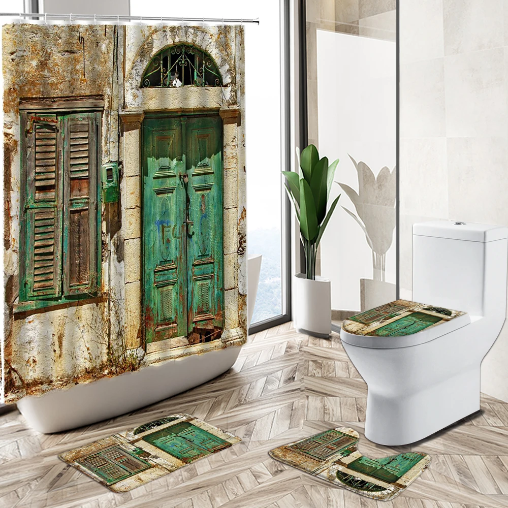 Product Name: Retro Vecchia Pietra Muro Di Mattoni Porta Tenda Della Doccia Set 3D Edificio Europeo Scenario Bagno Tappeto Antiscivolo Coperchio Wc Tappetino Da Bagno