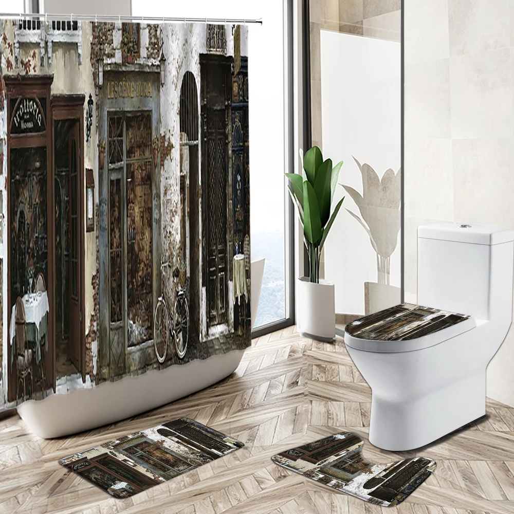 Special Offer Retro Vecchia Pietra Muro Di Mattoni Porta Tenda Della Doccia Set 3D Edificio Europeo Scenario Bagno Tappeto Antiscivolo Coperchio Wc Tappetino Da Bagno Discount (10%OFF) Today!