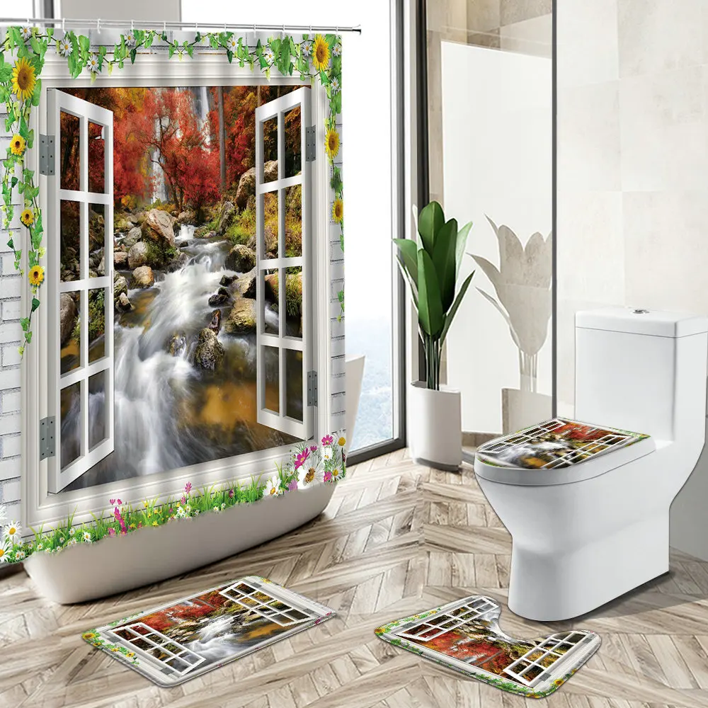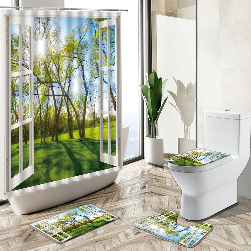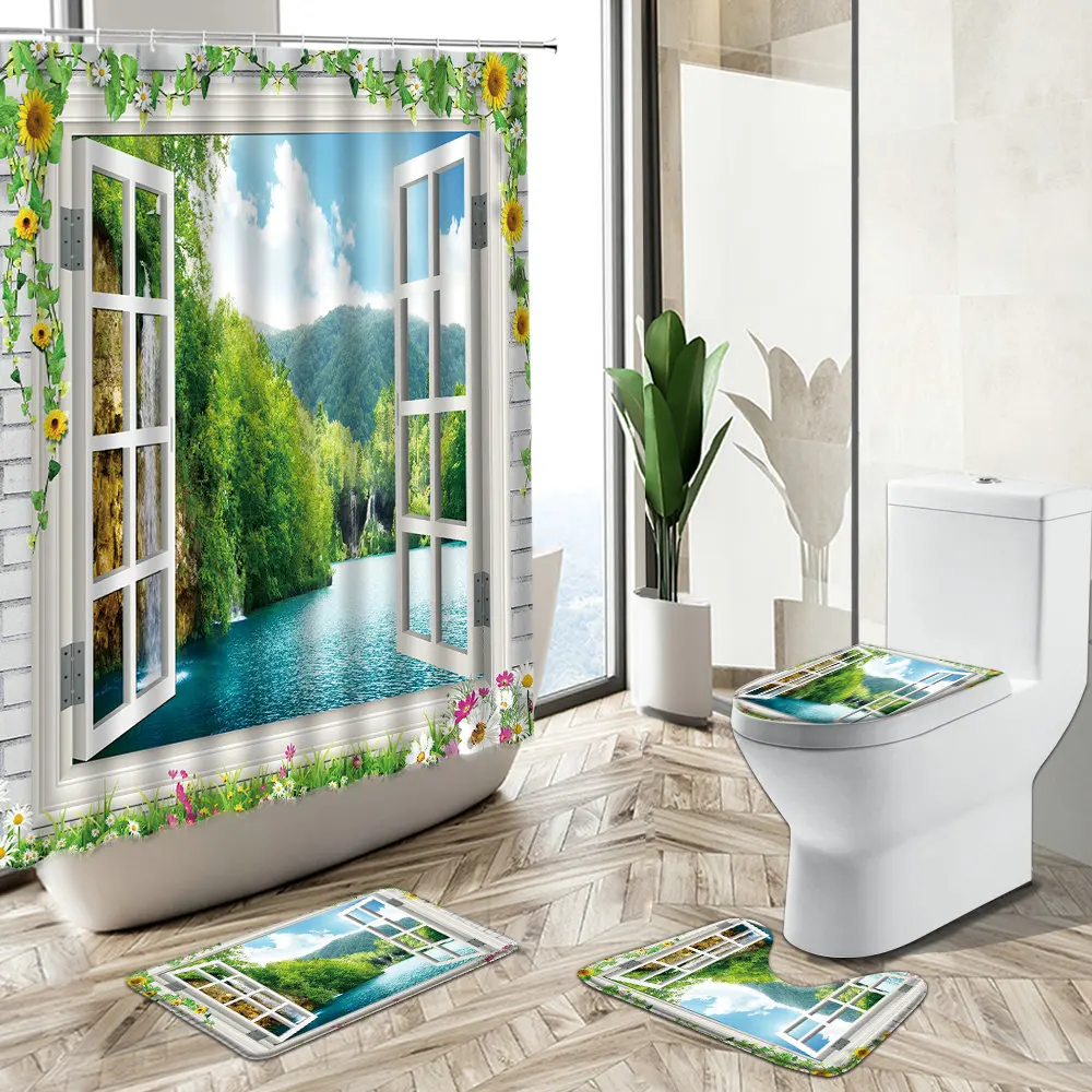 Special Offer Ocean Window View Tenda Per Doccia Fiore Pianta Verde Albero Foresta Cascata Scenario Naturale Tappeto Antiscivolo Copriwater Set Da Bagno Discount (48%OFF) Today!