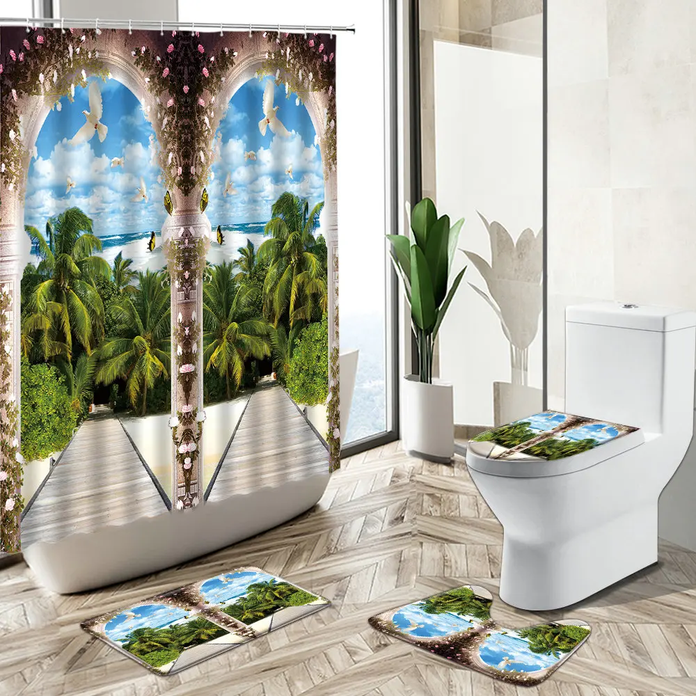 Product Name: Ocean Window View Tenda Per Doccia Fiore Pianta Verde Albero Foresta Cascata Scenario Naturale Tappeto Antiscivolo Copriwater Set Da Bagno