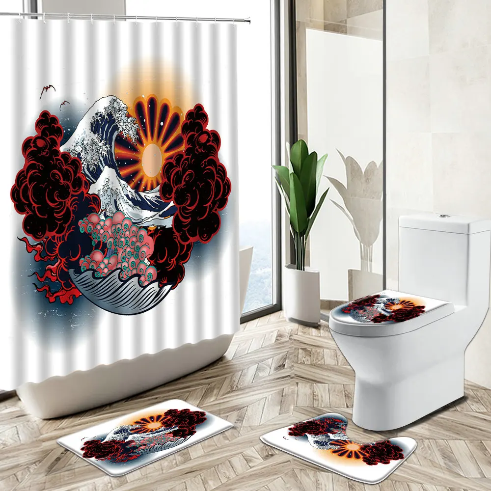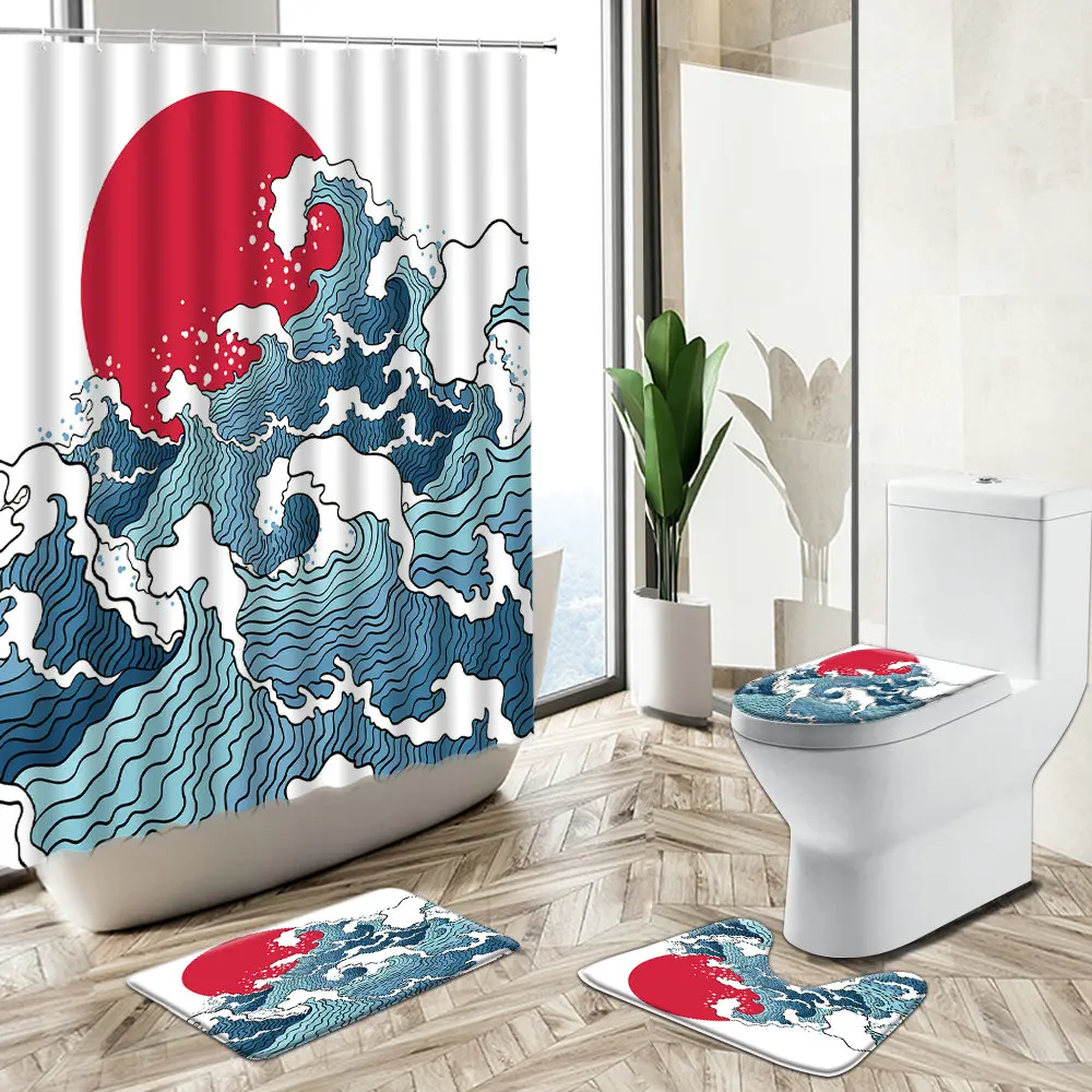 Product Name: Set Di Tende Da Doccia Per Bagno In Stile Giapponese Per Bambini Set Di Onde Creative Tappeto Antiscivolo Coperchio Del Coperchio Del Water Tappetino Da Bagno In Flanella Decorazioni Per La Casa