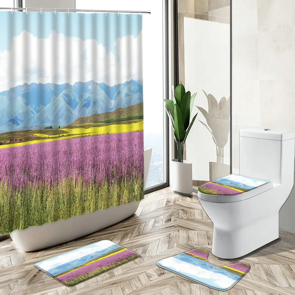 Product Name: Tenda Da Doccia Con Fiori Di Lavanda Pianta Di Girasole Campagna Scenario Naturale Tappeto Antiscivolo Con Piedistallo Copriwater Set Da Bagno