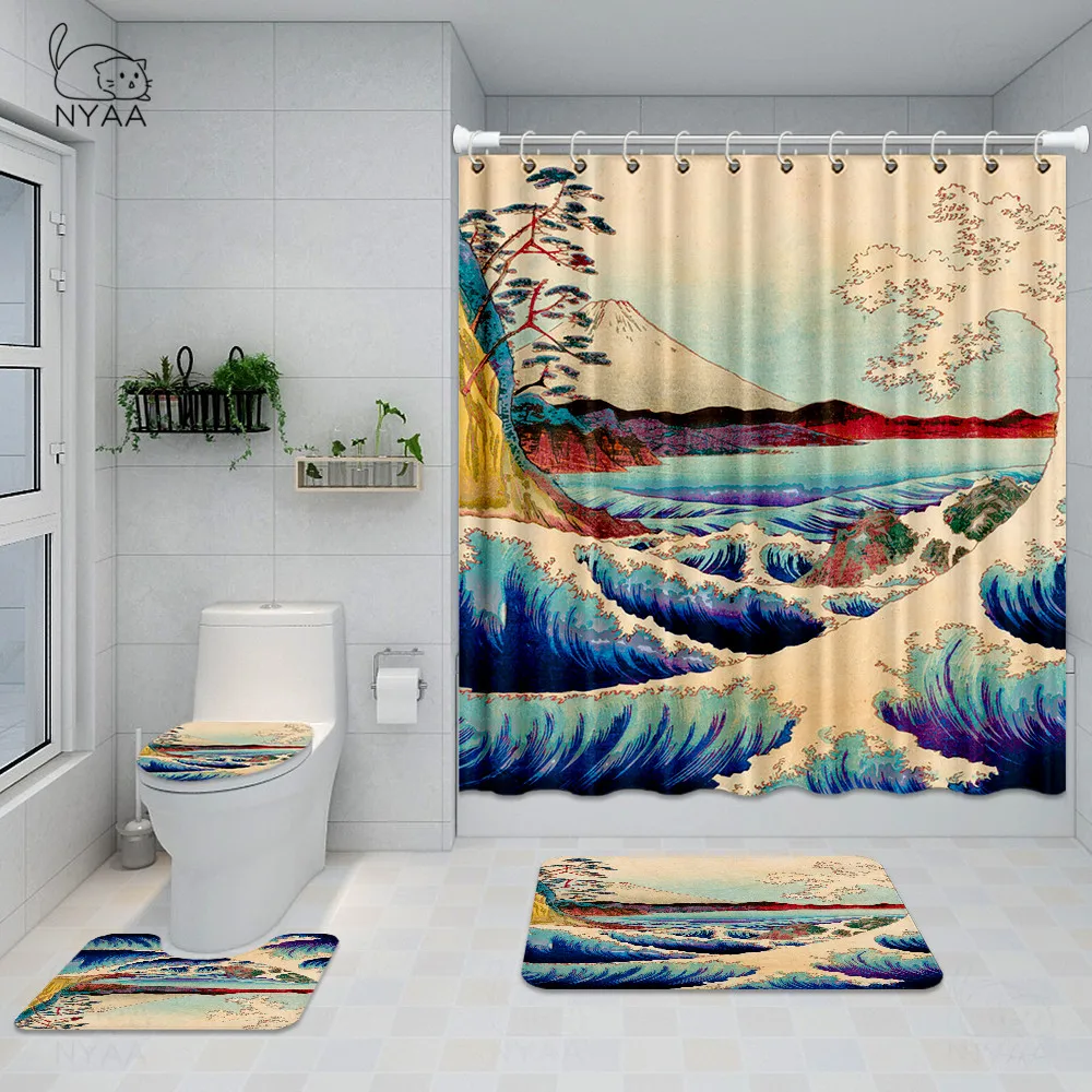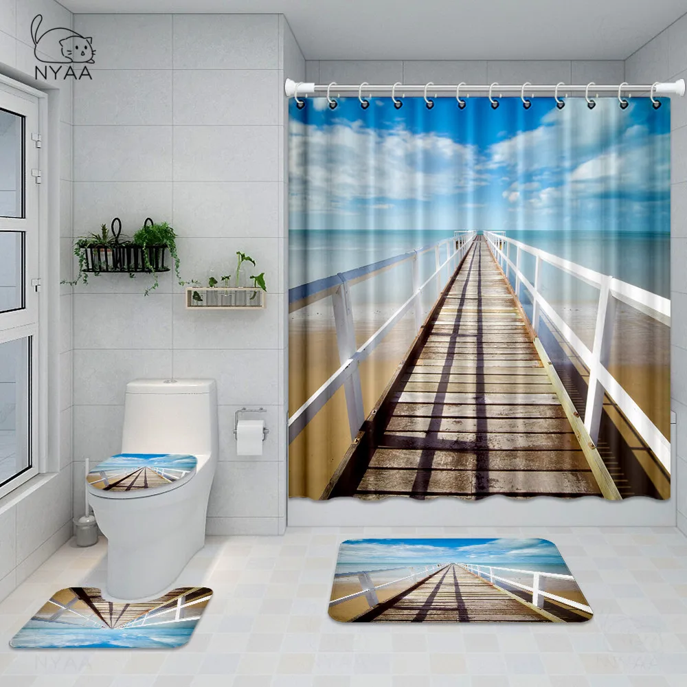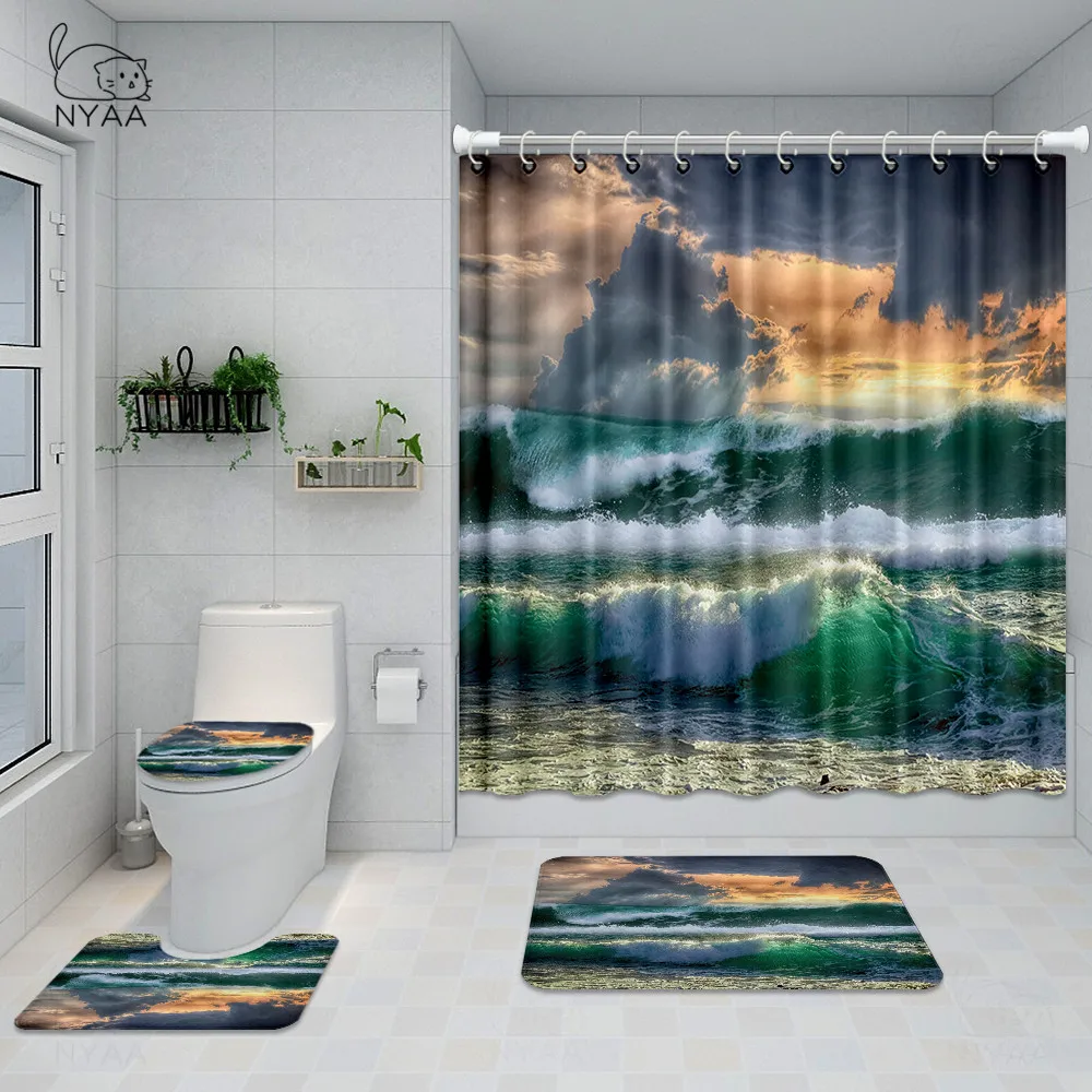 Product Name: Sea Tree Summer Beach Motivo Stampato Bagno Tenda Da Doccia Piedistallo Tappeto Coperchio Copriwater Tappetino Da Bagno Antiscivolo Set Di Tappeti