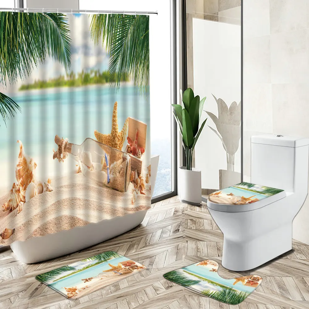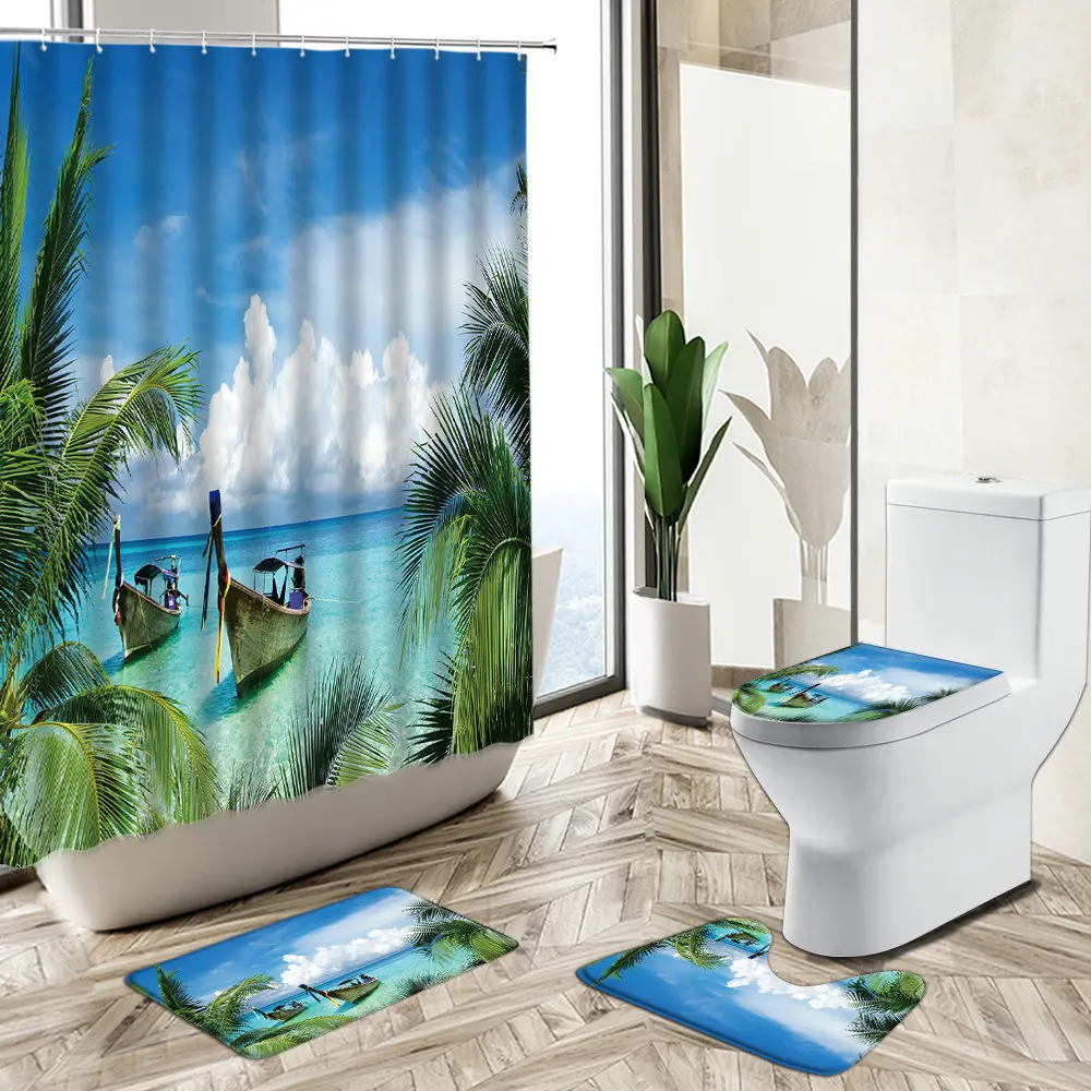 Product Name: Oceano Tropicale Pianta Verde Scenario Tenda Da Doccia Palma Albero Delfino Estate Spiaggia Scenario Tappeto Copriwater Set Da Bagno Deco