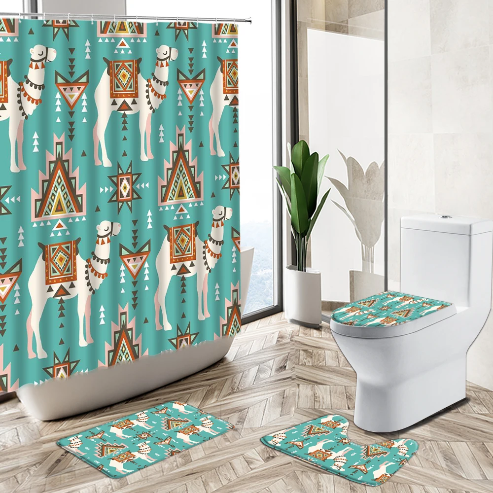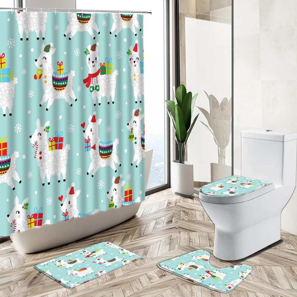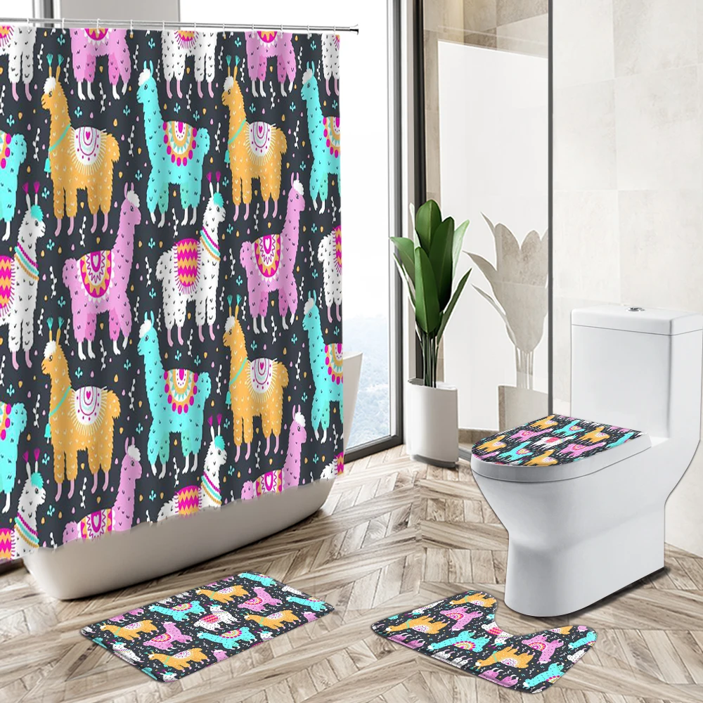 Product Name: Tenda Da Doccia Con Motivo In Alpaca Animali Del Fumetto Pianta Di Cactus Tappeto Antiscivolo Con Piedistallo Copriwater Set Da Bagno Per Bambini
