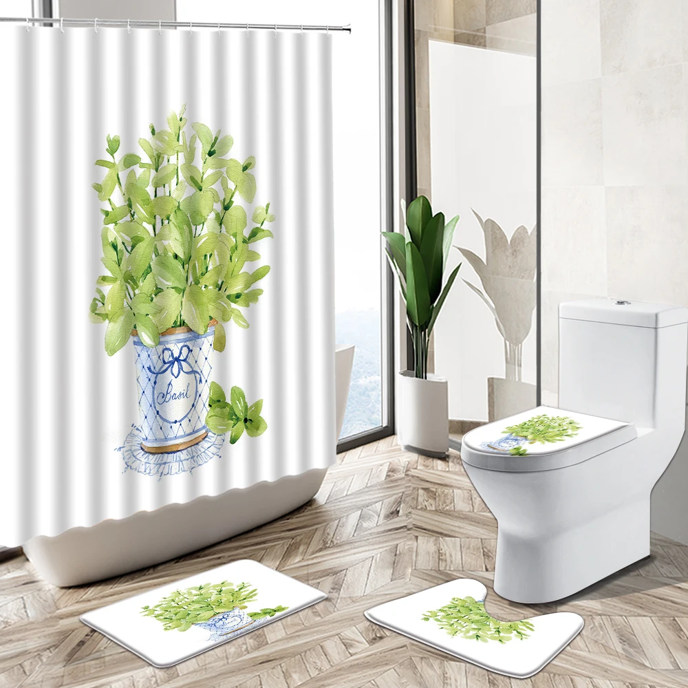 Product Name: Pianta Verde Foglia Tenda Da Doccia In Vaso Sfondo Bianco Decorazioni Per Il Bagno In Stile Nordico Tappeto Antiscivolo Coperchio Per Wc Set Tappetino Da Bagno