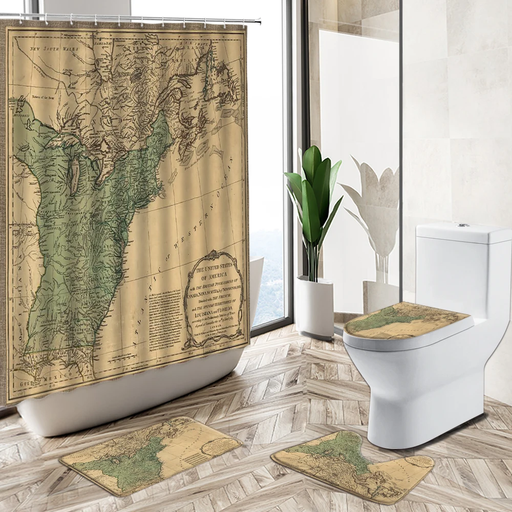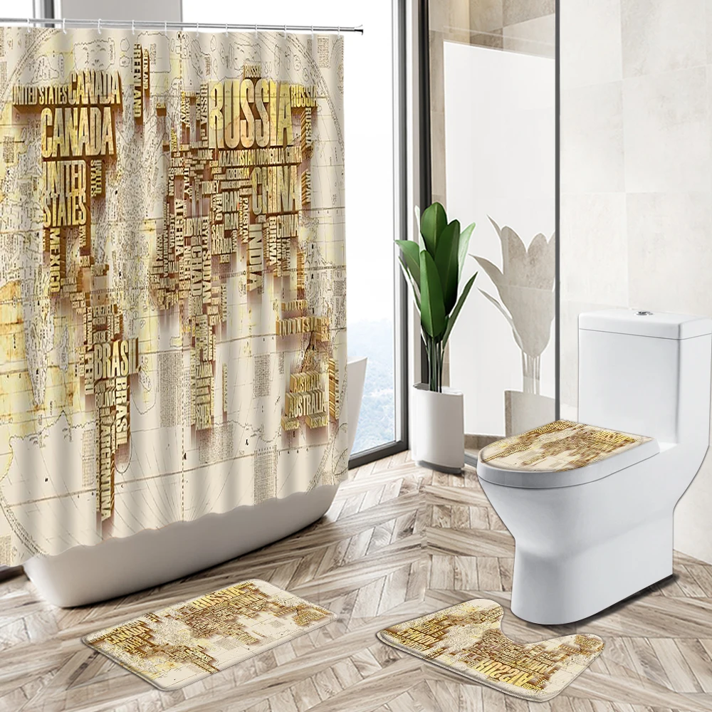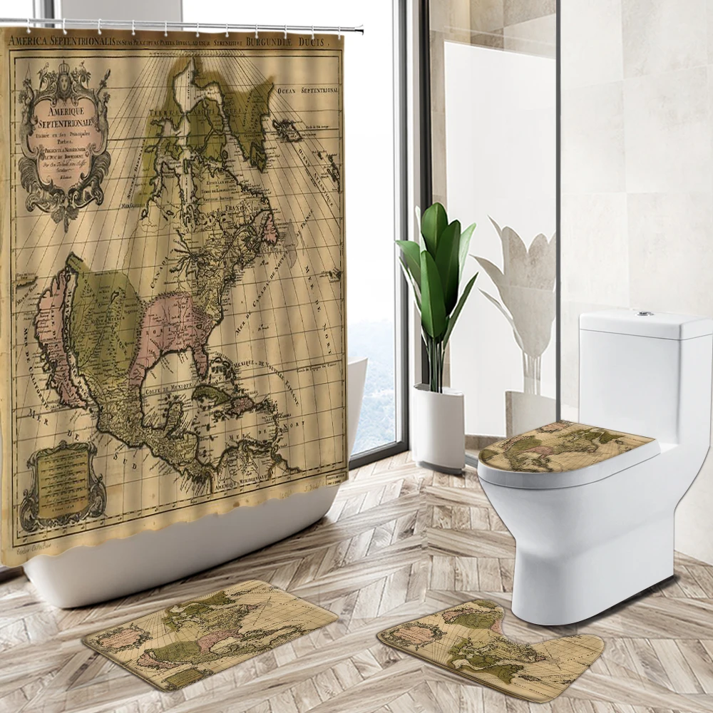 Product Name: Mappa Del Mondo Stampa 3D Set Di Tende Da Doccia Impermeabili Retro Vecchio Muro Di Mattoni Navigazione Bagno Antiscivolo Piedistallo Copriwater