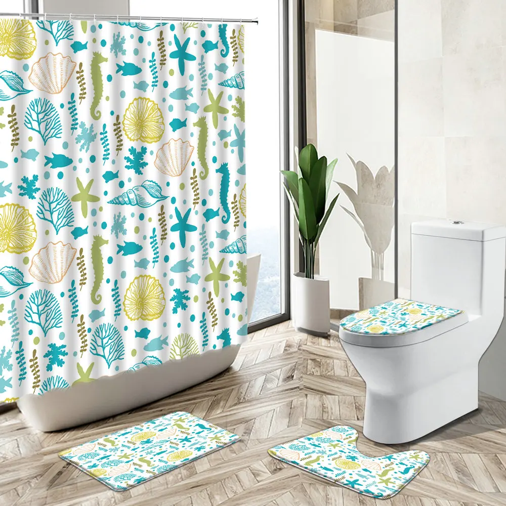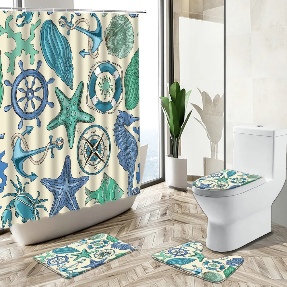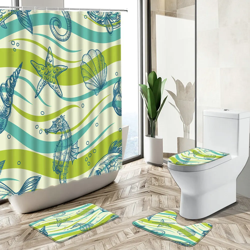 Product Name: Cartone Animato Stella Marina Conchiglia Conchiglia Bambino Bagno Tenda Da Doccia Set Divertente A Strisce Oceano Tema Tappeto Antiscivolo Coperchio Wc Tappetino Da Bagno