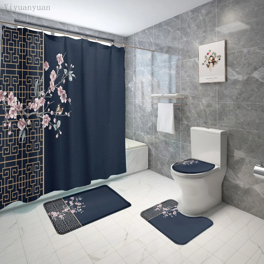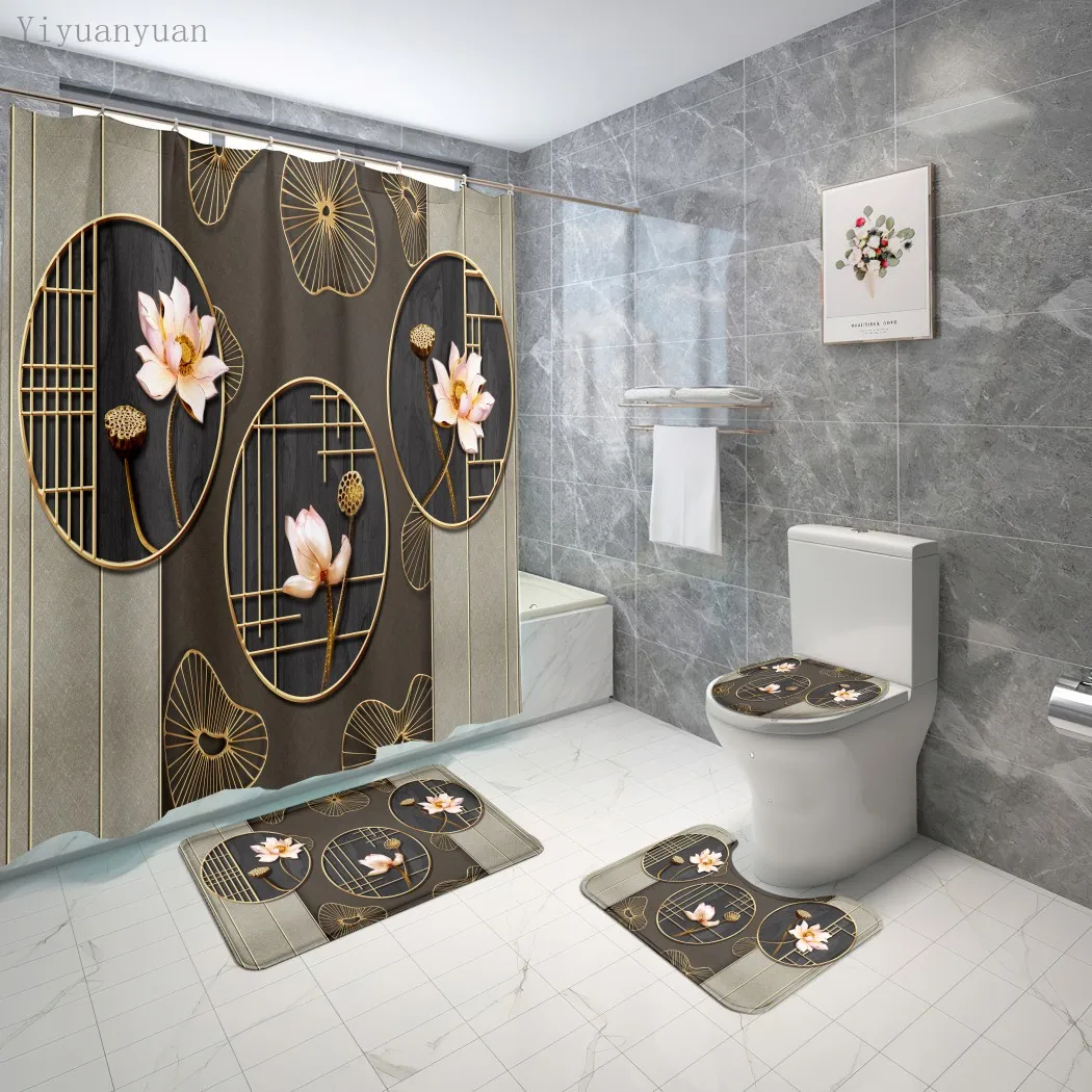 Product Name: Set Di Tappetini Antiscivolo Per Bagno In Stile Cinese Set Di Tende Per Doccia Stampate In Loto Di Bambù Coperchio Per Piedistallo Coperchio Per Wc Tappeto Da Bagno Tappeto S