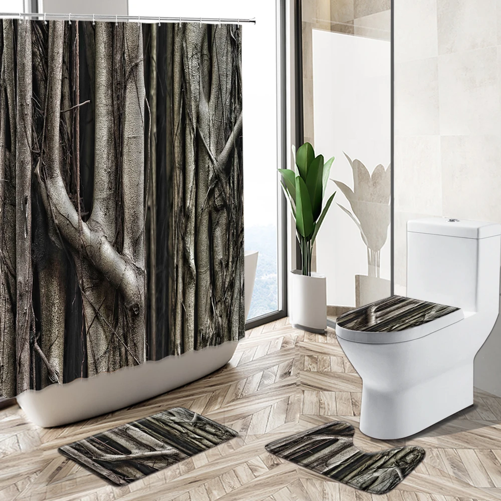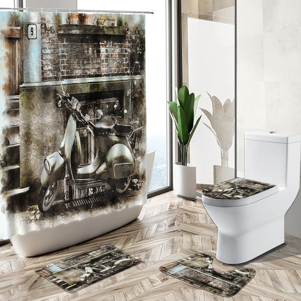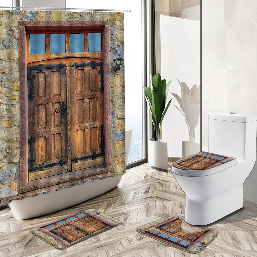 Product Name: Vintage Antico Antico Porta Di Legno Tenda Della Doccia Fattoria Di Campagna Fienile Pietra Muro Di Mattoni Piedistallo Tappeto Copriwater Bagno Deco Set